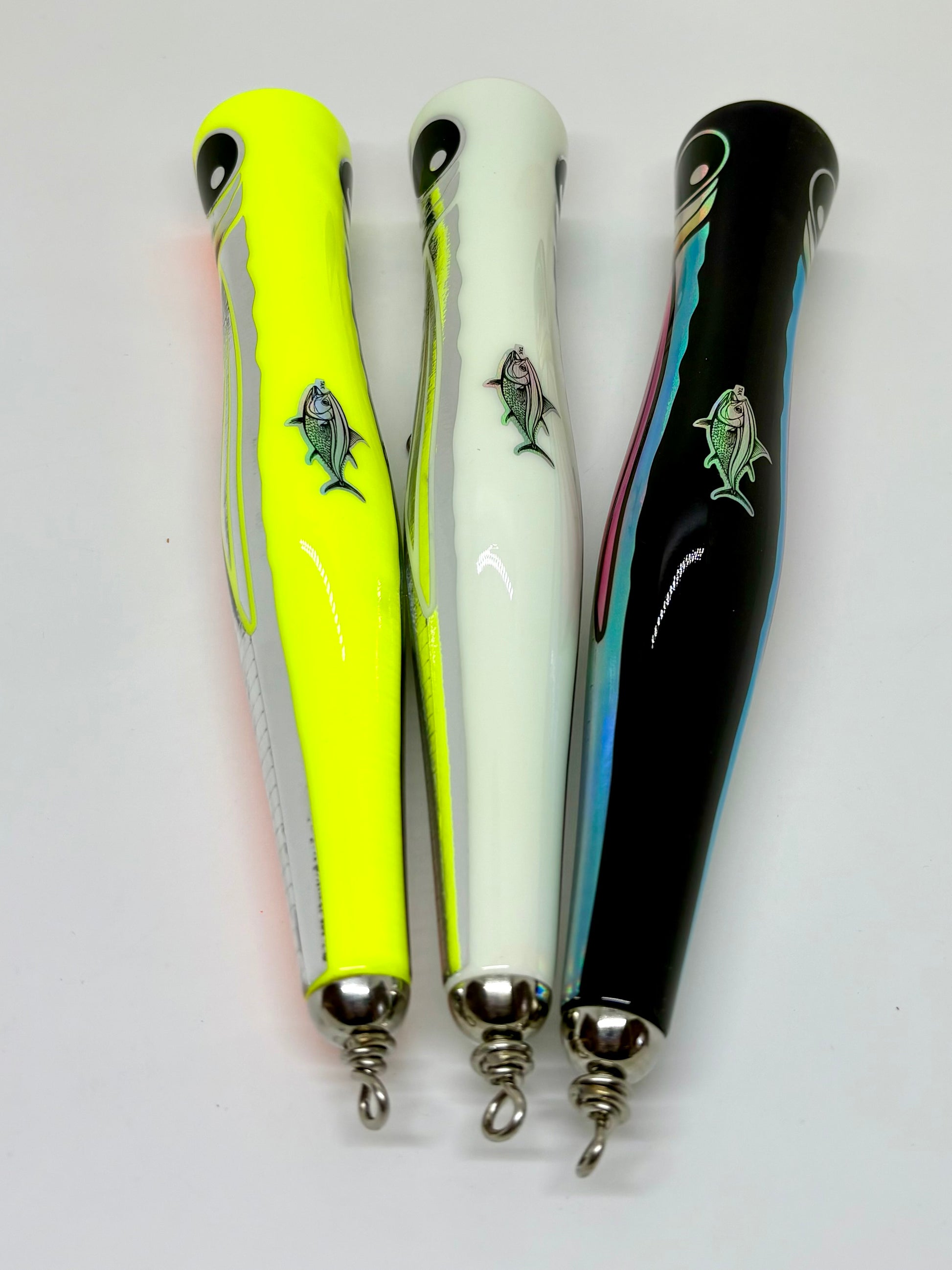 Crafted for long-range casting, these poppers fly like a bullet and move serious water — making them irresistible to tuna. The slim profile cuts through wind with ease, while the cup face throws heavy surface disturbance on the pull.